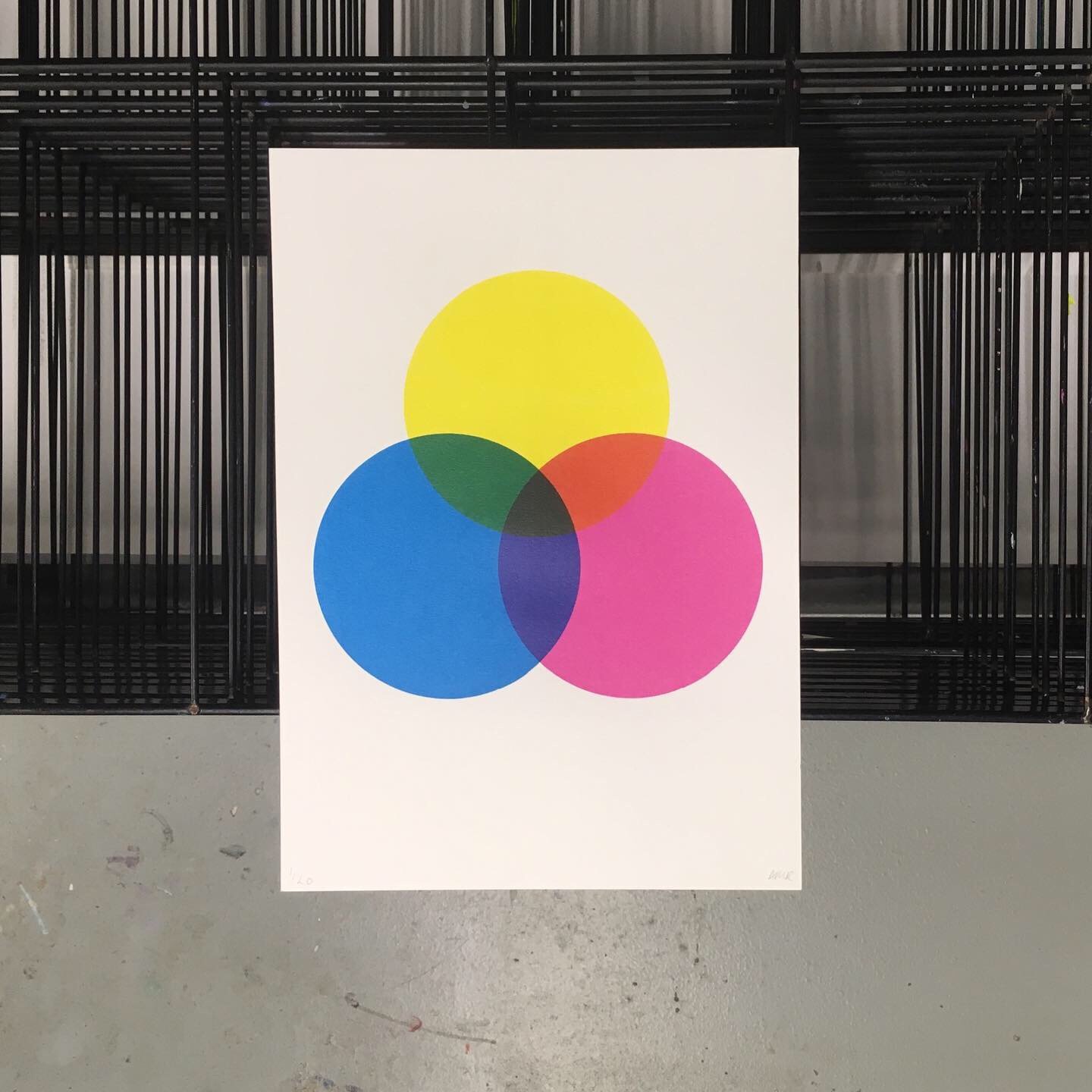 A small print to investigate the qualities of overlapping colours with transparent screenprinting ink. Using cyan, magenta and yellow.